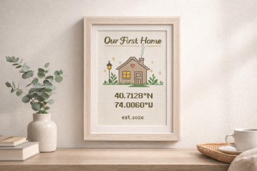 Custom Coordinates Cross Stitch Pattern PDF – Our First Home Personalized Embroidery Design, Housewarming Gift, Modern Counted Cross Stitch Chart, DIY Home Decor Download