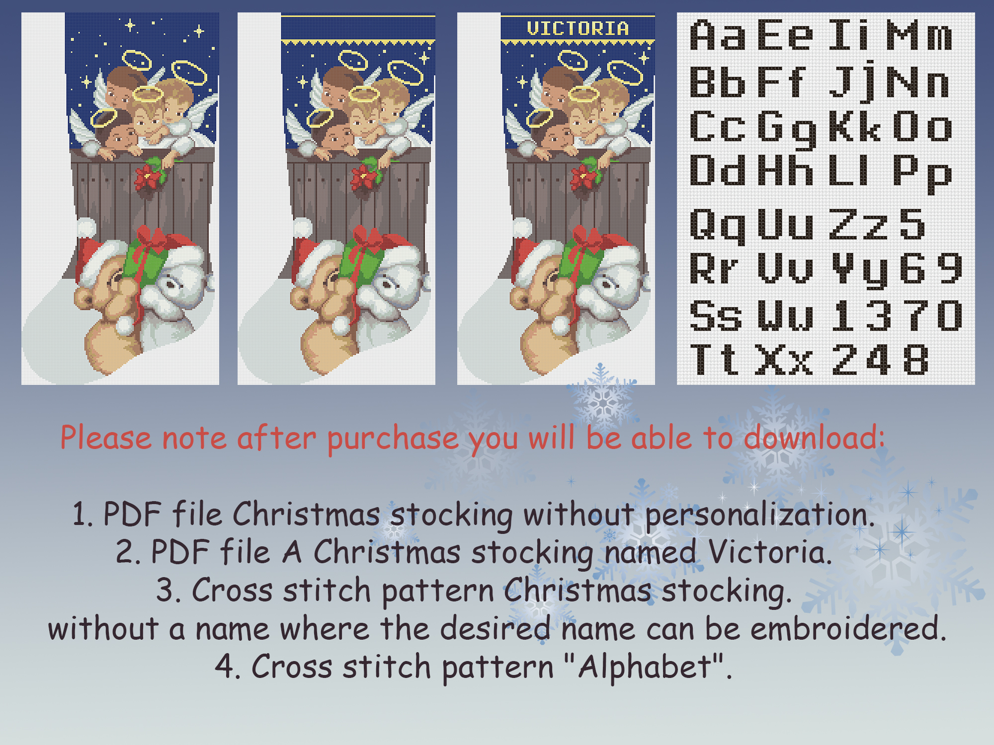Cross Stitch Pattern Christmas Stocking PDF, Personalized Modern Counted Easy Simple Cute Angel Bear Holiday Stockings Cross Stitch Chart For Beginners DIY, Digital Download