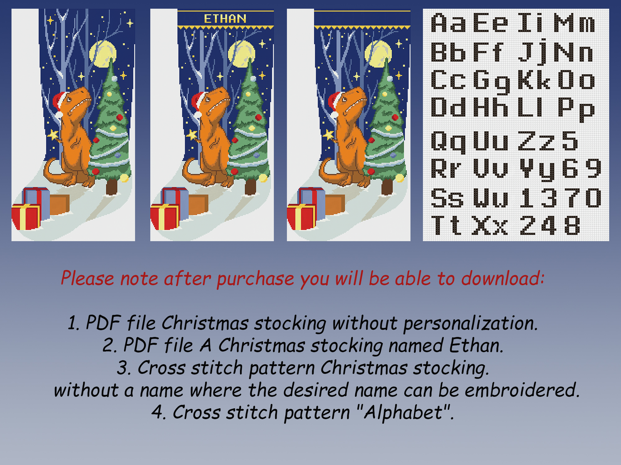 Cross Stitch Pattern PDF, Personalized Christmas Stocking Modern Counted Printable Easy Simple Cute Funny Dinosaur Holiday Stockings Cross Stitch Chart For Beginner DIY, Digital Download