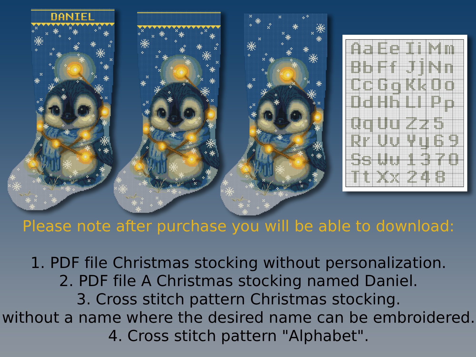 This digital cross stitch pattern features an adorable baby penguin wrapped in glowing Christmas lights — the perfect festive project for both beginners and experienced stitchers.