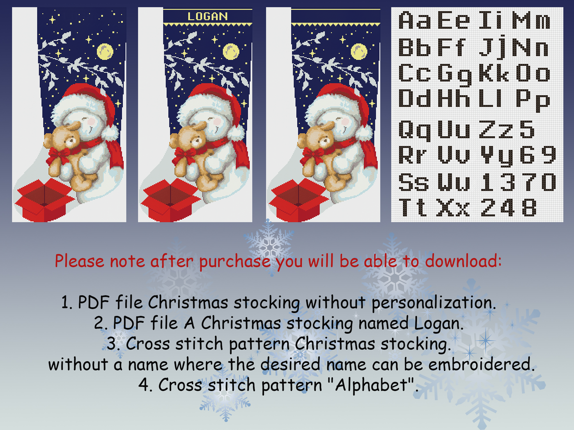 Cross Stitch Pattern PDF, Personalized Christmas Stocking, Modern Counted Easy Simple Cute Snowman Bear Holiday Stockings Cross Stitch Chart For Beginners DIY, Digital Download